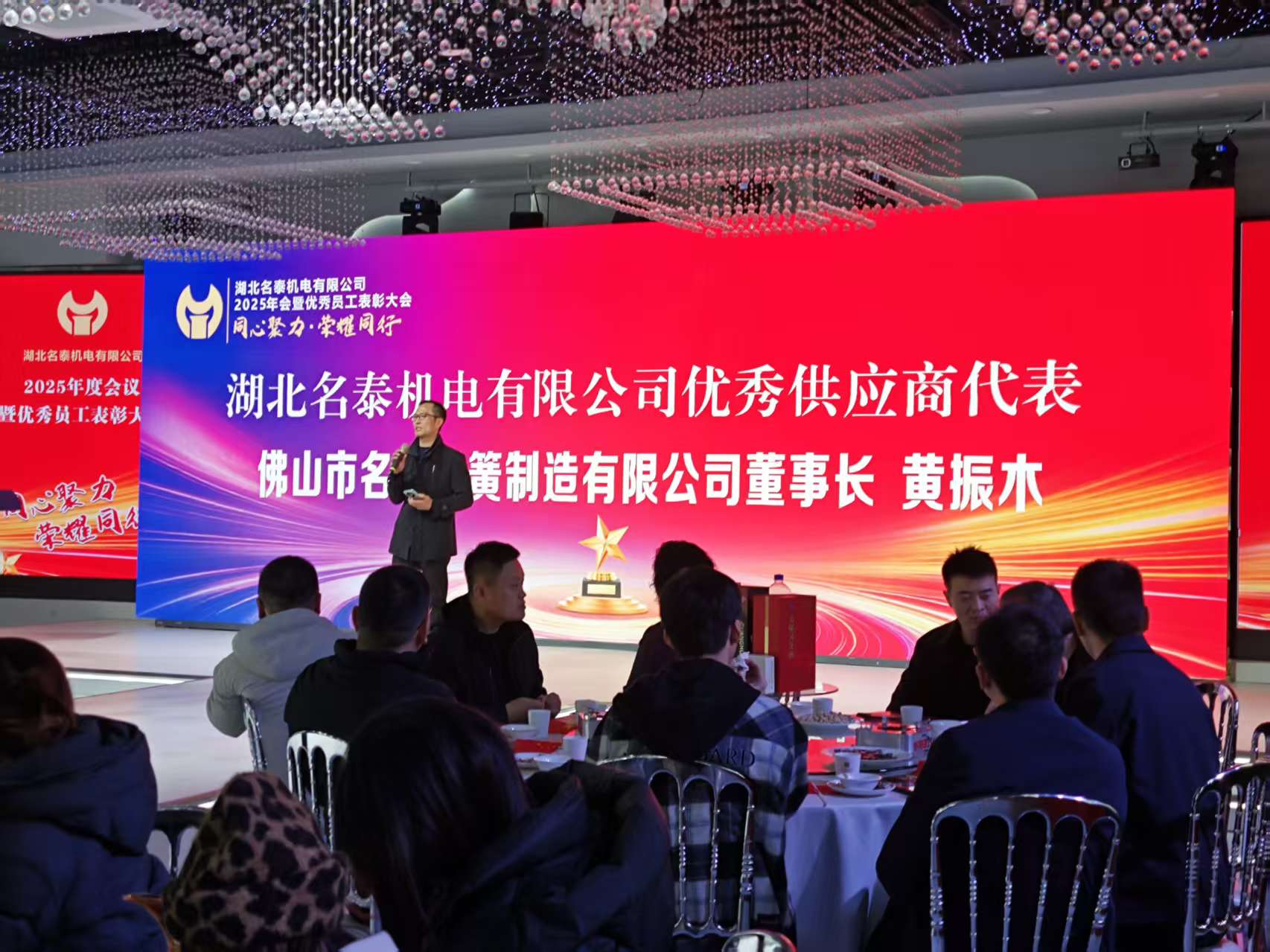 近日,湖北名泰机电有限公司2025年会暨优秀员工表彰大会隆重举行,现场氛围热烈,掌声雷动。我司(佛山市名汽弹簧制造有限公司)凭借25载的诚信履约、品质坚守与高效服务,荣获“优秀供应商”称号,公司代表黄振木先生受邀出席大会,并作为优秀供应商代表上台发表感言,传递合作初心,共绘发展蓝图。